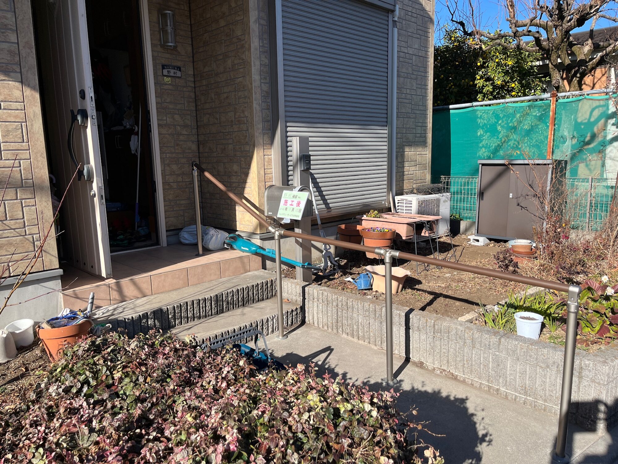 玄関アプローチ手すり設置御